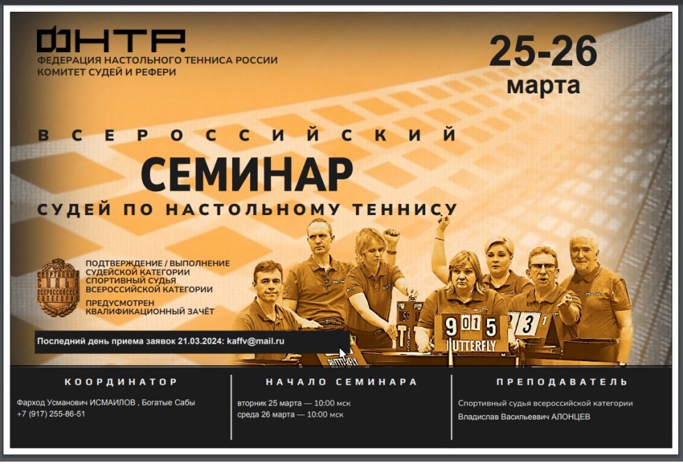 25-26 март көннәрендә штп. Байлар Сабасы (Татарстан Республикасы) Бөтенроссия судьялар семинары узачак. Чара программасына теоретик һәм практик дәресләр, шулай ук тиешле судьялар категориясенә квалификация зачеты тапшыру керә.